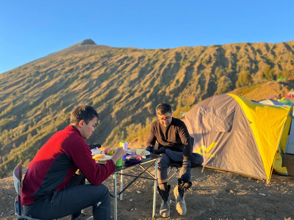 On the second day, you will be woken up at 02:00 AM. The porter and guide will prepare breakfast and hot drinks like coffee or tea. After that, the ascent to Mount Rinjani’s summit will begin. The trail is quite steep and dark, so it is recommended to bring a flashlight. The hike to the summit will take about 3 hours. As you approach the summit, the path will become more sandy and gravelly. Upon reaching the summit before sunrise, you will enjoy beautiful views of Lombok Island, including the three Gilis (Gili Trawangan, Gili Meno, and Gili Air), as well as Segara Anak Lake with Mount Baru Jari in the middle. After enjoying the summit, the descent back to the Sembalun campsite will take around 2.5 hours.